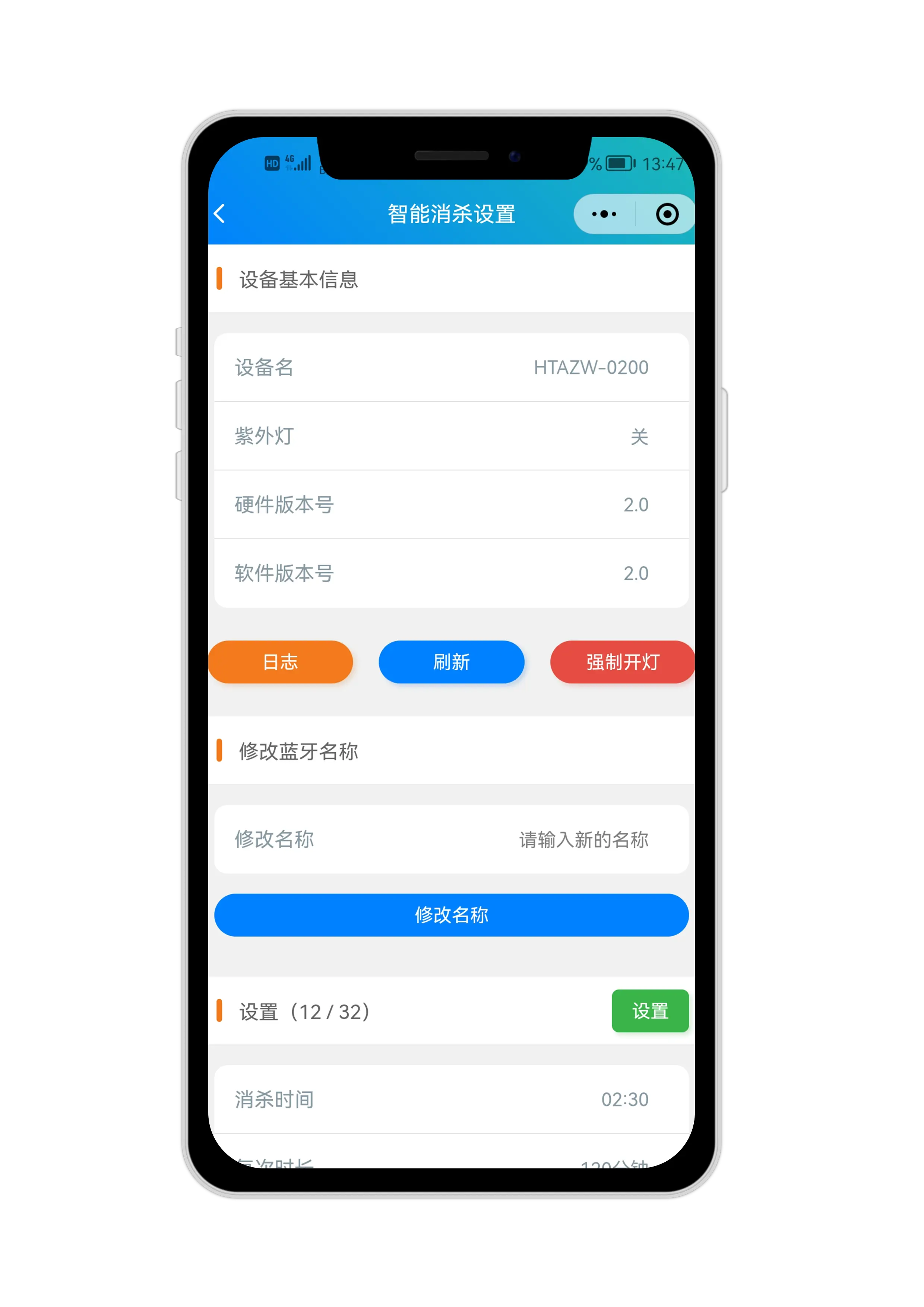 紫外线消杀装置操作平台,通过小程序控制及设置消杀参数,可设置消杀时长、消杀间隔,以及消杀灯的工作模式。必要时,可手动开启、关闭紫外线消杀灯。