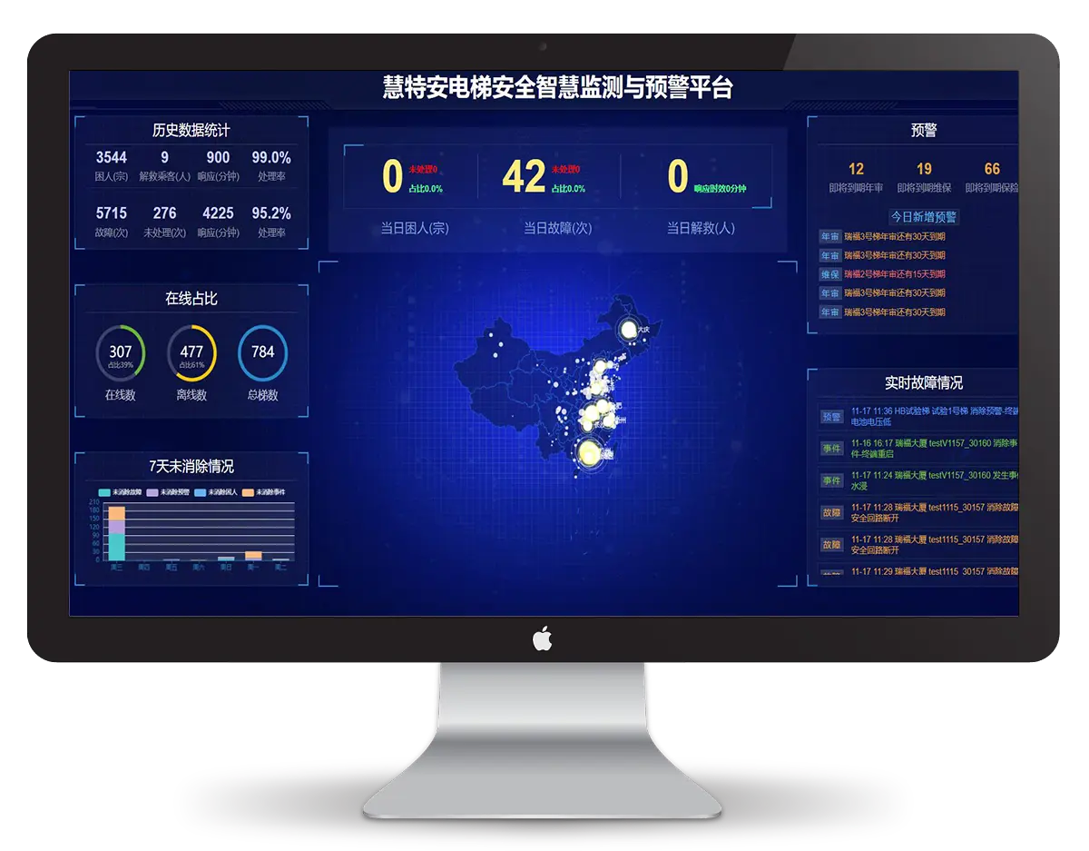 慧特安电梯智慧监测与预警平台,简称“慧梯云平台”,即“互联网+电梯安全”云平台。平台运用物联网、云计算和移动互联网技术,充分整合了监察部门、检验机构、制造单位、使用单位、乘梯人,实现了快速报警、及时救援、风险预测、安全监察、维保管理、检验管理、社会监督等功能的高科技平台,为电梯安全运行和电梯管理提供强大技术支撑,最大限度保障乘梯人的安全。